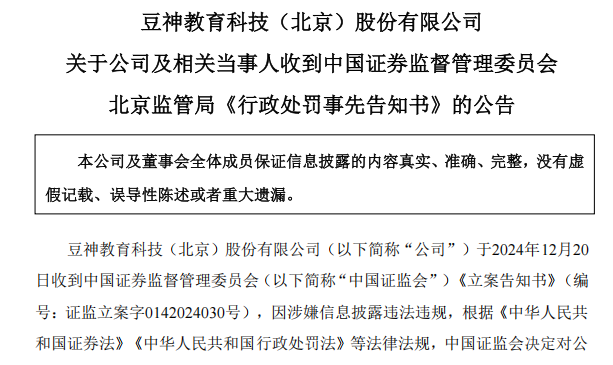 此次豆神教育信披违规案,于去年12月由中国证监会下发《立案告知书》。近日公告显示,该案现已调查完毕。